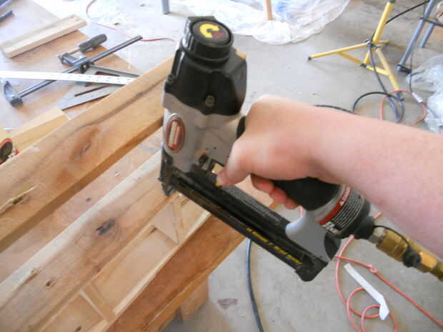 Utilice una pequeña de pegamento en el extremo de cada pieza. Poner unos clavos a través de las articulaciones y se realizan. Si usted está usando un martillo y clavos o un clavo que la pistola no totalmente el asiento... Sugiero un conjunto de uñas. Puede conseguir 3 de ellos en diferentes tamaños en cualquier home center por unos cuantos dólares y usted utilizará una y otra vez. Esta es una buena inversión.
