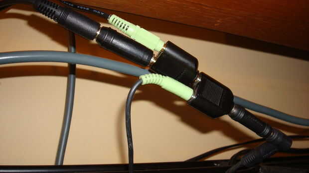 para abarcar la longitud de la sala para los altavoces posteriores, usé un cable de 1/4 de pulgada y luego volvió en 1/8.