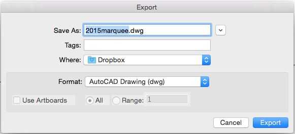 Una vez que esté satisfecho con su dibujo, guardarlo en el formato de archivo correcto para su software de CAD. Estoy usando SolidWorks, así ahorraré mi archivo en formato .dwg. Formatos de archivos que el software corrobora antes de exportar el archivo.