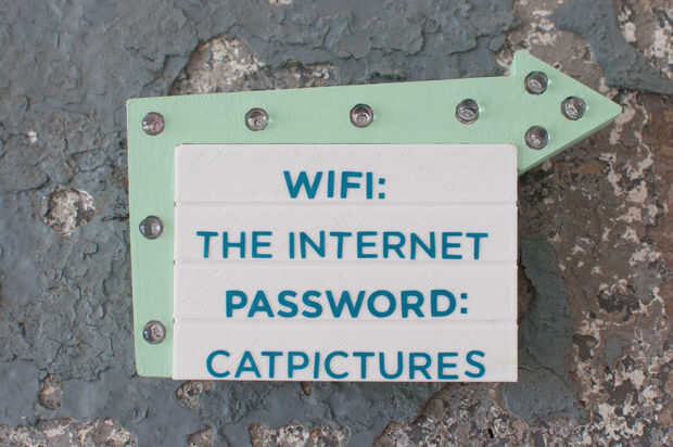 Texto puede trabajar tu signo para usted (que tus amigos conozcan la contraseña de wifi), o ser un elemento decorativo en tu signo. Desde que decidí hacer una lectura de muestra de estilo, necesita algo de texto para hacer la muestra completa! Usé Letras de vinilo pequeño para agregar texto a mi signo. También podría utilizar etiquetas, stickers o incluso seco borra el marcador para escribir sobre tu signo.