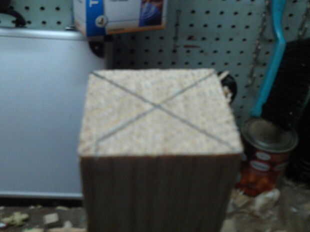 En primer lugar, encontrar el centro del extremo de la Junta, como se muestra en la imagen A. Esto es fácil de hacer un truco que aprendí de un maestro: dibujar una línea diagonal desde una esquina a otra. Trazar dos diagonales. La intersección será el centro. Por supuesto, esto sólo es perfecto si el material es un prisma rectangular, u otra forma geométrica cuyas diagonales biseca mutuamente.
