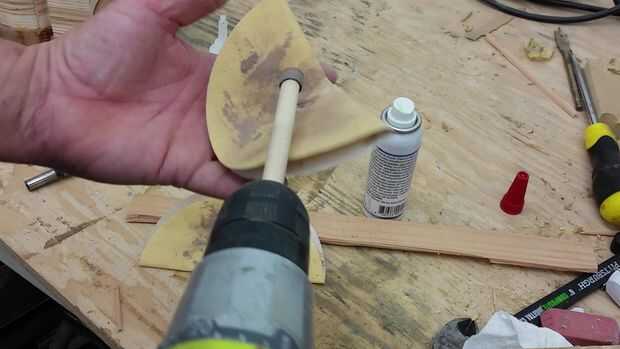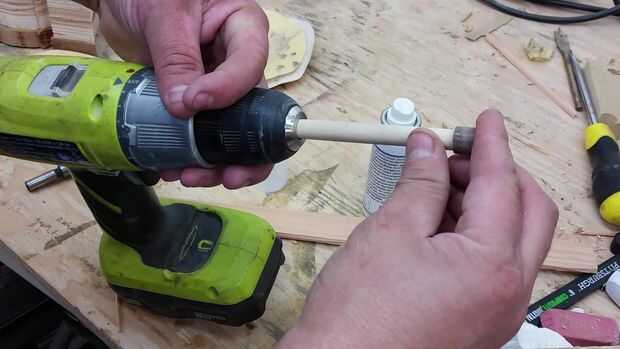 Me gustaron los filos de los tiradores, así que decidí que iba a los cantos sobre. Para acelerar el proceso, tiraron una varilla de pasador a mi taladro. Usé una pequeña cantidad de pegamento C A temporalmente conectar el enchufe a la espiga. Dedica el taladro y utilizando un trozo de papel de lija, redondea los bordes sobre. Me rompió el tapón de la espiga y repite este paso para los restantes tiradores.