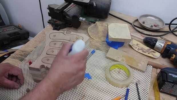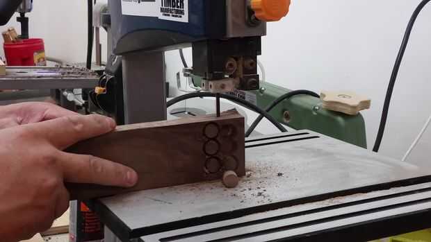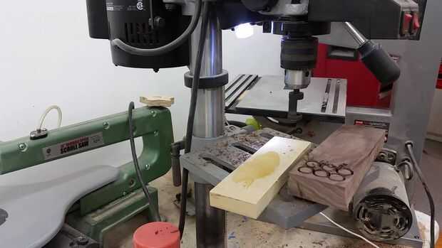 Usé mi taladro y un cortador de enchufe de 3/8" para cortar los tiradores. Puede utilizar un taladro de mano si no tienes una prensa del taladro. Tomé el pedazo de madera a la sierra y cortar los tapones.