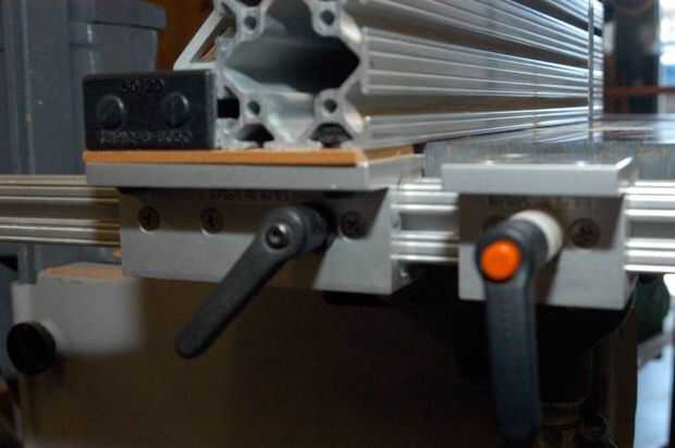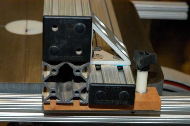 Perfore un agujero en línea con la ranura de la izquierda de la 2040, además de otro para mando/pernos de fijación. Estos agujeros deben ser significativamente grandes (~5/16 "). Ver notas en la imagen 3. Especialidad de la tuerca/perno para la fijación de la cuña para el 2040 si no ser acomodado muy bien. El objetivo principal de esta tuerca de calce y fijación del extremo es evitar que la valla la flexión si se aplica mucha presión al cortar.