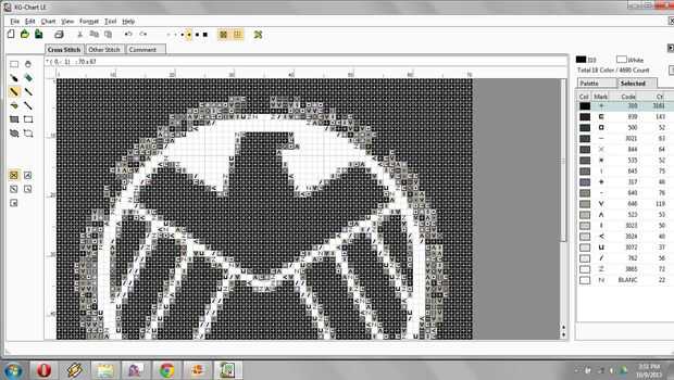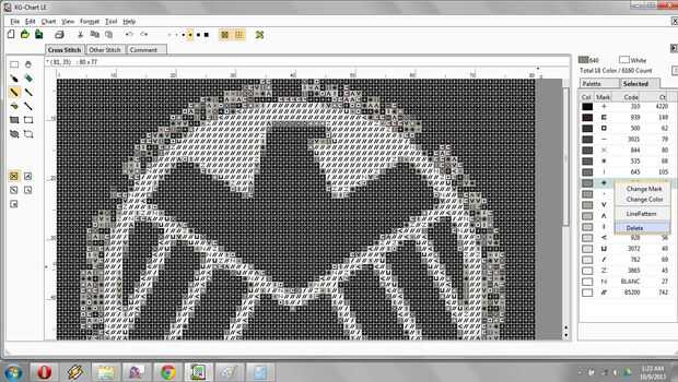 Existen dos técnicas para cambiar todos aquellos puntos gris y apagado-negro/off blanco a lo que queremos. El primero es eliminar colores no deseados. Ir a la seleccionada en la barra lateral de la derecha para ver los colores que ya han sido utilizados en el gráfico. Sabemos que solo con mirar que los colores DMC que queremos usar son 310 y BLANC. Para tomar un color, haga clic derecho y usar Delete para eliminarlo. Usted debe ver plazas vacías aparecen donde antes tenías puntos. Para una mejor vista, aquí está una imagen de lo que ocurre cuando eliminamos B5200 (aunque va a ser en la tabla en un segundo, no se asuste).