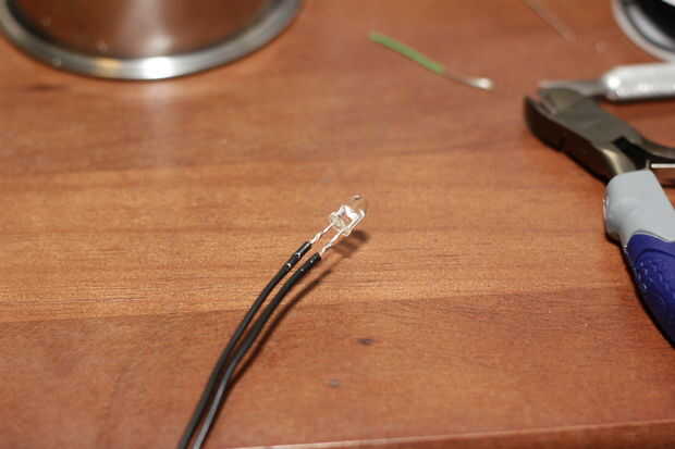Tira de los cables principales y estrechamente a soldarlos a las patillas del LED el LED. Recuerde que los pernos son positivos y negativos. Si se olvida, puede ver el interior del diodo y Dile. Los pines conecta a una pieza de metal grande y una pequeña pieza de metal en el diodo. El mayor de los dos pedazos de metal internos es el lado negativo, el más pequeño es positivo. Encontrado este por olvidando cuál fue que después cortan.