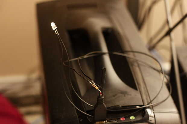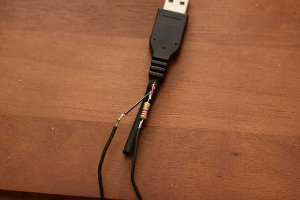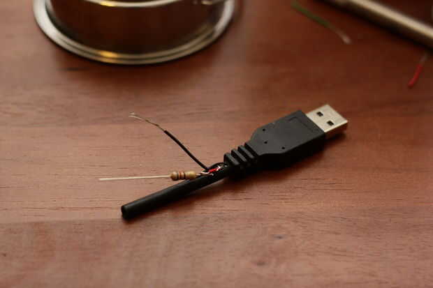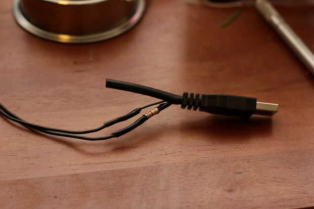 Después de se suelda todo para arriba, enchúfelo y asegúrese de que funciona. Esto es importante en caso de que algo estaba en mal estado. Usted no quiere terminar el proyecto sólo a encontrar un cable estaba mal o una Junta de soldadura era mala. Después de usted confirman que está trabajando, selle las juntas con cinta adhesiva o algún líquido de la cinta. CRAM los cables en el lado USB de nuevo en la vaina tanto como puede y luego la cinta copia de seguridad.