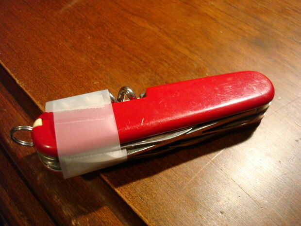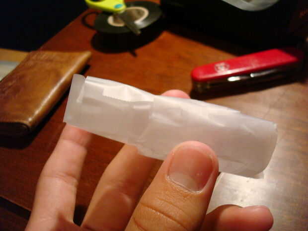 decidí usar cinta scotch para el interior, por lo que pude conservar mi cinta aislante. cualquier cinta trabaja para este proyecto. usted se envuelve el objeto con la cinta de adentro hacia afuera, (lado pegajoso hacia afuera). cruce la cinta por el extremo o punta. una vez hecho el ajuste, retire la funda, no Envuelva demasiado apretado o será difícil que baje. entonces bloquearla.