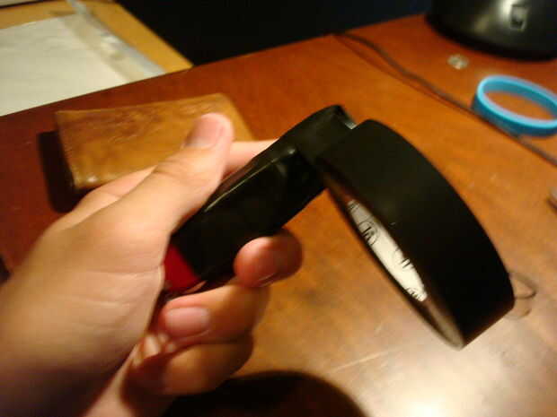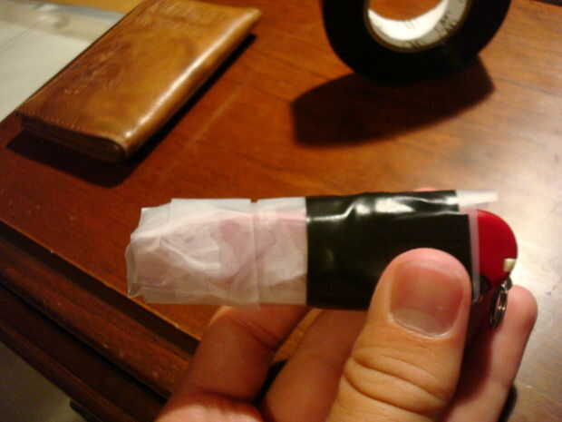 ahora, tome su cinta solicitada (se trata de la parte exterior) y comenzar a envolver la parte superior, sobre la cinta de adentro hacia afuera. Asegúrese de que no Envuelva demasiado apretado o será difícil bajar la manga. cruzar la cinta para formar el extremo (punta) y luego envolver sobre él para los mejores resultados. decidí envolver una vez más para hacer una suave envoltura final. Esto también es más fuerte. coger la funda apagado y corte como se muestra para hacer un borde perfecto.