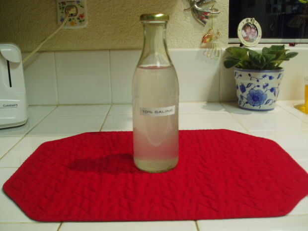 Así que primero medimos 1 "parte" de la solución saturada o 50 mL de la solución saturada o maestro y vierta esto en la segunda botella. A continuación medimos 9 "piezas" de agua. Desde 9 x 50 = 450 sabemos que necesitamos 450 mL de agua en la taza de medir. Vierta esto en la segunda botella, tapa y etiqueta 10% solución salina.