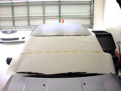 Mantener temporalmente el papel en su lugar, he podido usar los limpiaparabrisas y utilizar un solo filo de navaja o cuchillo para cortar el borde superior. Siga a lo largo de la copa junto a la moldura en el borde del parabrisas. No necesita presionar duro, todo lo que necesitas hacer es cortar el papel. Una vez que tienes el borde superior cortado, utilice unos trozos de cinta para mantener el papel en su lugar mientras haces los otros bordes.