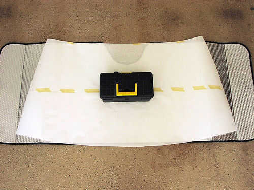 Coloque la plantilla sobre la sombrilla aplanada. Asegúrese de que quede centrada y la parte superior de la plantilla está en el borde superior de la sombrilla. Mueva la plantilla para obtener la mejor cobertura. Áreas donde hay papel con ninguna sombrilla debajo van a ser las brechas en la cobertura. Favoreció el borde inferior un poco más por dos razones: las viseras de sol pueden rellenar un poco en la parte superior, y mi coche tiene un "labio" en el interior borde que la sombrilla puede participar para un buen ajuste inferior. Una vez que tienes la plantilla donde usted lo desee, perno con algo pesado que le mueva alrededor.