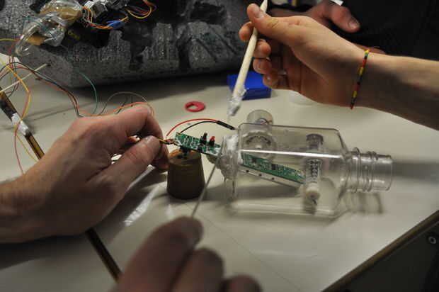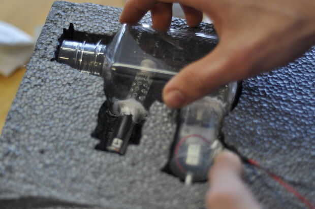 Cortar los botella de plástico y hacer agujeros para ambos sensores, toma de aire, salida de aire y calentador. Colocar los elementos dentro de la botella y pegar hermético con silicona no agresivos (que utiliza para los trabajos de azulejos de baño OK). No olvide hacer algún tipo de válvula de presión para la salida de aire - de lo contrario la presión del aire dentro de la cámara será el mismo como fuera.