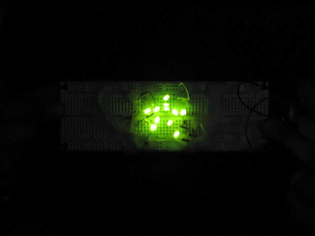 Para mi primer proyecto que decidí hacer un súper rápido que brilla intensamente verde en forma de estrella exteriormente con algunas resistencias y LEDs poniendo alrededor.