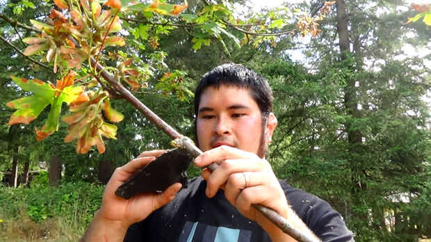 Ahora es momento de comenzar a tallar el atlatl. El primer paso es encontrar una rama conveniente. Usted quiere algo que está en algún lugar entre 1/2 una pulgada a 1 y 1/2 pulgadas de diámetro. Cuanto menor sea la rama, menos trabajo para obtener un agradable atlatl de alto rendimiento. Al mismo tiempo, también el riesgo el atlatl romper especialmente si caer o caído. Cuanto más gruesa la rama requiere más trabajo, pero el resultado será más duradero y darle más opciones para el ajuste y acabado posteriormente.