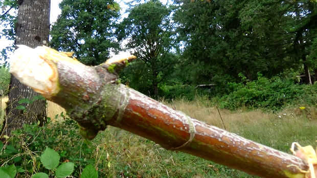 Con su hacha de mano o similar grande del corte de la herramienta, cortar una rama cerca de una rama. La rama tampoco se utilizará como un estímulo, o la base reforzada de una espuela tallada integral. Estoy usando maple, pero casi cualquier madera trabajará para ello. Madera verde es más fácil trabajar con herramientas de piedra que la madera seca o experimentado.