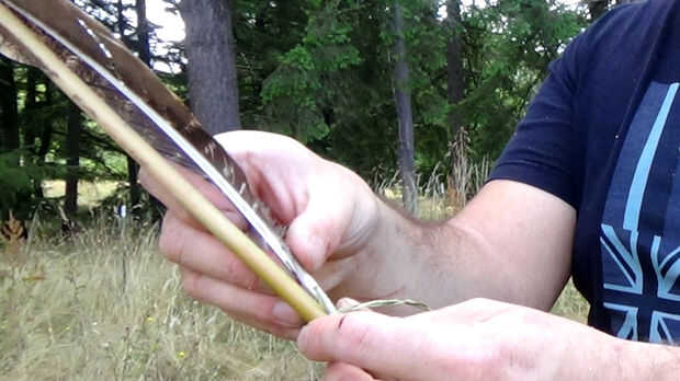 Una vez que tengas algún cable, simplemente atar la pluma y la punta de la pluma al eje dardo cerca del final. Esto puede hacerse con un simple envoltorio o simplemente varios nudos para fijar el cable en su lugar. Hacer lo que usted está cómodo con. Una sugerencia es no cortar los extremos sueltos del cordón como se puede utilizar más adelante. Nunca se sabe cuando un pequeño cable adicional puede ser útil y el dardo a volar aún sin las remeras. También puedes atar el extremo inferior y dejar el extremo posterior de la pluma suelta.