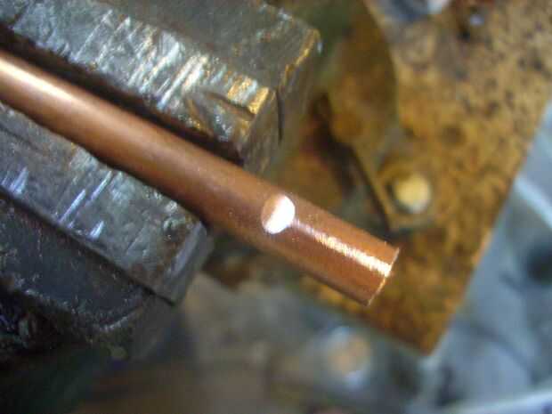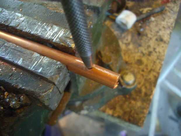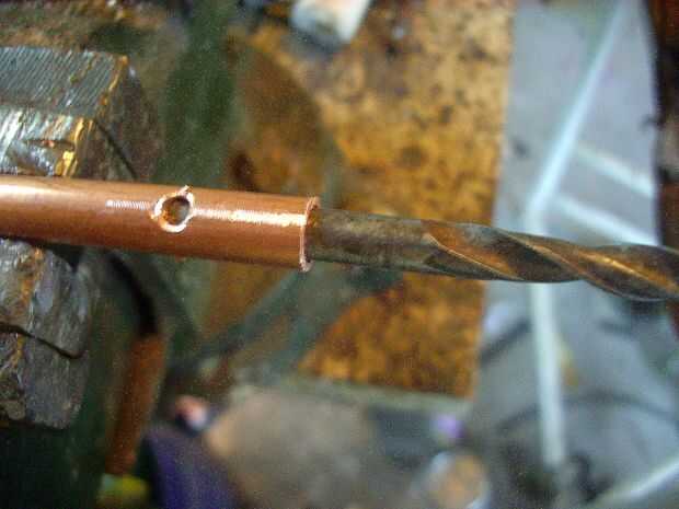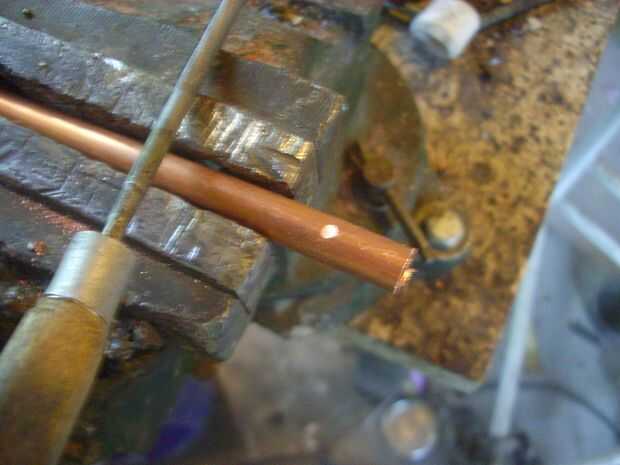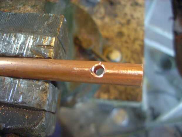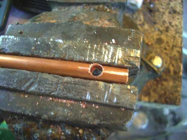 La tentación se presenta ahora para cortar el "tallo" de la T, pero he hecho antes y luego tuvo problemas para armar todo. Es mejor antes de preparar el empalme, para lo cual debemos empezar haciendo que el tubo de cobre un agujero con un diámetro aproximadamente igual al interior del tubo, en mitad de una pulgada o tan de su extremo. Previamente debe marcar la zona con una lima redonda y hacer un "piloto" o "diver"