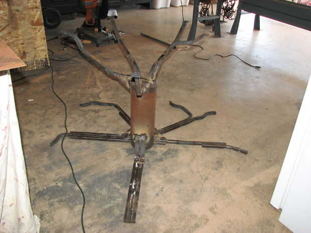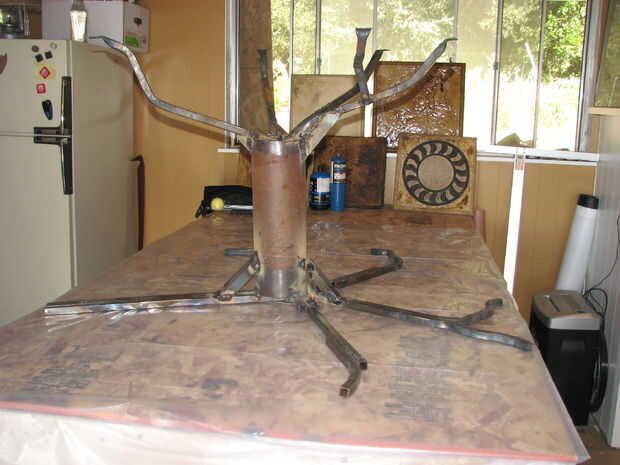 Si usted tiene acceso a una tienda de metal o herrería, doble la tubería es fácil. Ir de curvas al azar, interesante; raíces y ramas de los árboles pueden hacer casi cualquier cosa. Por ejemplo, mi árbol de aguacate tiene una rama que sacacorchos. Sólo asegúrese de que al soldar con autógena sus ramas al tronco (la pipa grande), uno de los extremos está en el mismo plano que la parte inferior de la tabla. No tiene que ser perfecto, pero estrecha. Se puede ajustar más adelante con el tubo.