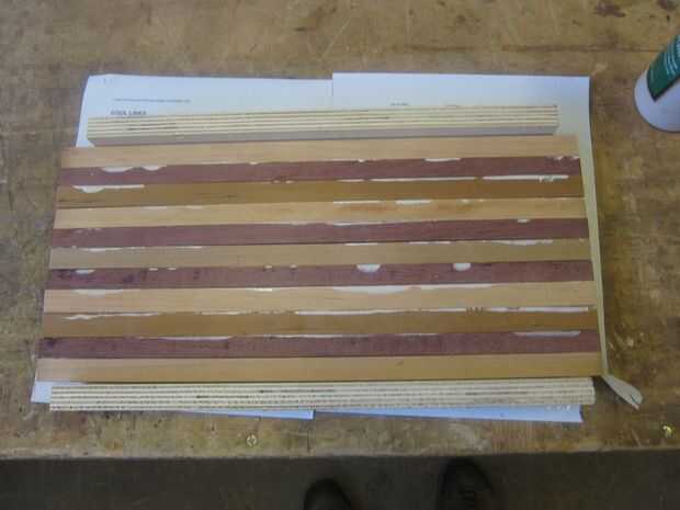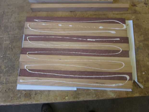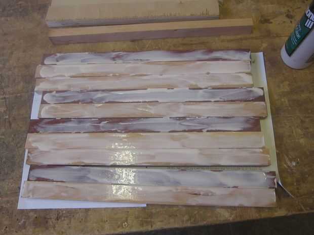 Hacia la madera de desecho de papel, voltear cada pieza en su parte posterior y untar pegamento en todas las piezas excepto una (la última de ellas en línea obtiene pegamento de su vecino). Al parecer aprendi nada desde el jardín de la infancia desde este paso siempre termina con mis dedos con pegamento blanco.