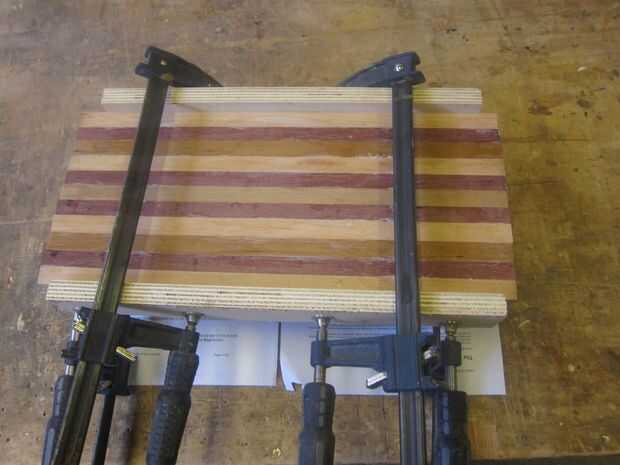 Voltear las piezas a pie y asegúrese de que todos ellos se alinean antes de sujeción todo juntos. Utilicé unos trozos de madera de desecho para evitar que las abrazaderas de abollar la tabla para cortar.