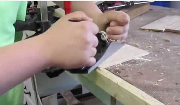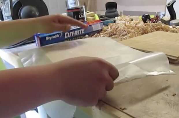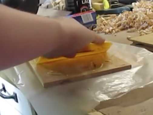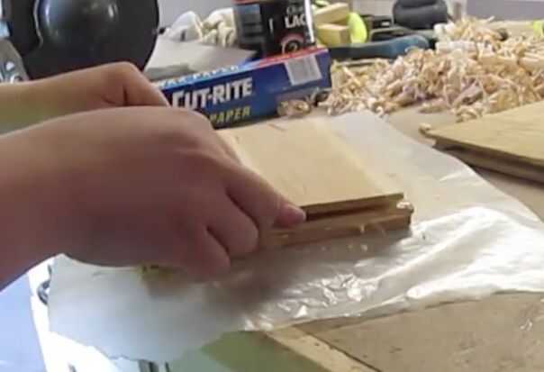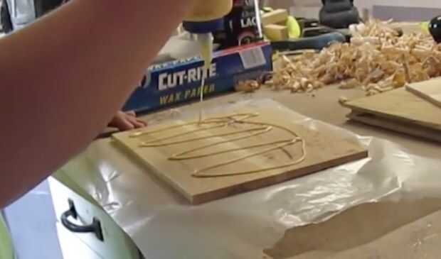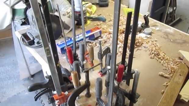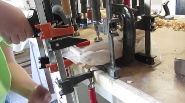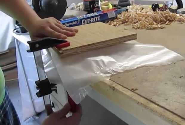 Una vez que el pegamento se haya secado, usé un plano de la mano para aplanar las superficies. Después de eso, pegué las tres capas junto con los paneles con el grano longitudinal en el exterior. Quería distribuir uniformemente la presión de sujeción como he podido, así que envuelve dos piezas de madera contrachapada en papel encerado e intercala las capas entre ellas. Esto ayuda a distribuir uniformemente la presión de sujeción y no tendrás ningún abolladuras en su tabla de cortar de sus pinzas.
