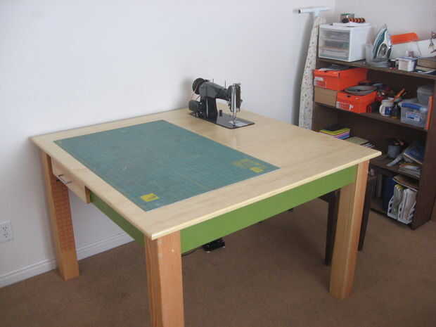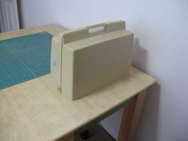 Para guardar polvo de la máquina cuando no se está utilizando la cubro con la parte superior de un viejo caso de costura. Un borde recto fue colgado de un clavo en una de las patas de la mesa ya que era demasiado grande para poner en los cajones, y algunos estantes cercanos mantener costura adicional y artículos de artesanía.