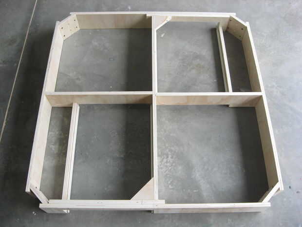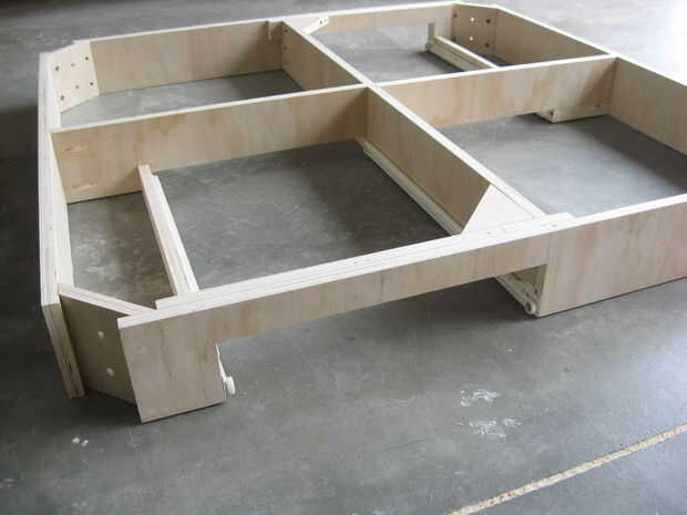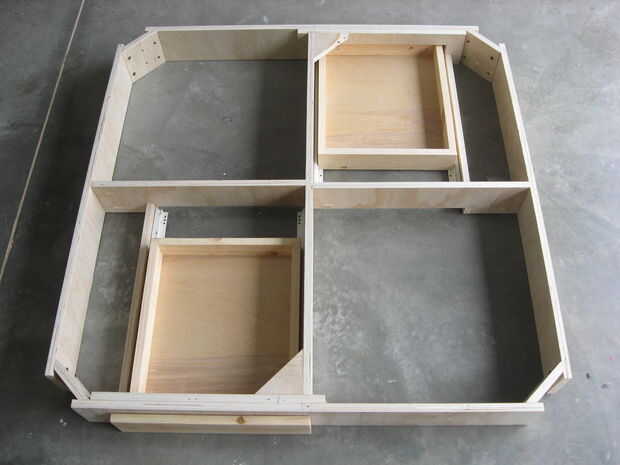 Los cajones fueron hechos de pino con bases de madera contrachapada de 1/4". Estos se instalaron con varias modificaciones y soporte piezas de agregado a la estructura de la falda para hacer todo encajar y funcionar muy bien juntos. Al final me alegré que yo incluido, ya que son una característica muy interesante.