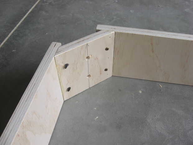 Para construir la estructura de la falda, empecé por cortar seis tiras de 5" por 48" de madera contrachapada. Cuatro de éstos fueron recortado a 38 1/2" para utilizar como las piezas fuera de la falda. Las abrazaderas de las cuatro esquinas son 5" longitud con ambos extremos biselados a 45 grados. Estos fueron pegados y viraron temporalmente en su lugar con clavos pistola clavos 1 1/2" en los extremos de cada lado. Todo fue pretaladrado y sujetado firmemente con tornillos.