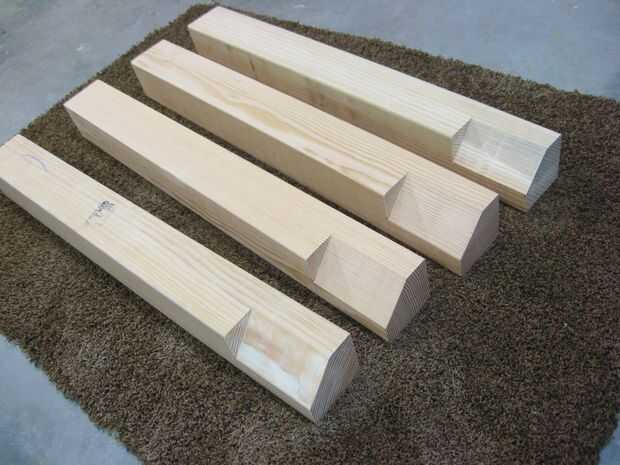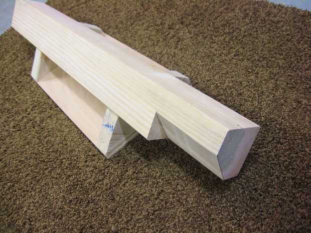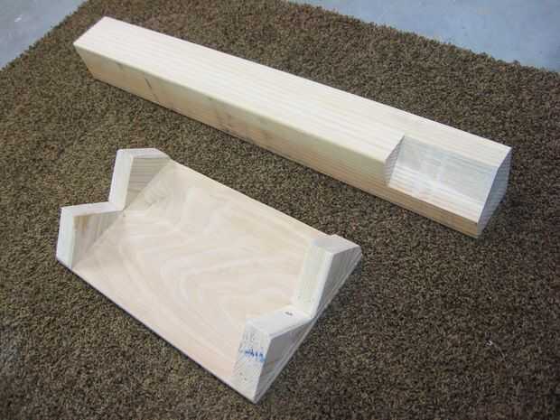 Para perno de éstos a la estructura de la falda, una muesca de 45 grados debía primero ser cortado de la parte superior de cada pata. Hice esta usando una sierra de cinta con un jig casero para sostener las piezas en el ángulo correcto.