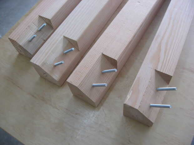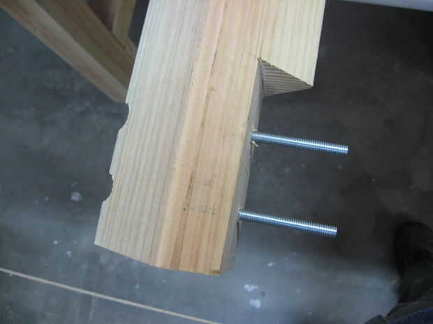 Para los pernos que haz encajados en la parte superior de las patas de la mesa, usted puede comprar los pernos de pata de mesa especial que grueso, tipo tirafondo rosca en una mitad. Taladra un agujero donde desea el perno sobresalga, y con una tuerca roscada sobre el lado del perno como va a ir, atornillar la parte lag abajo en la madera y retire la tuerca. Esta es una opción, pero estos tornillos de lujo son un poco demasiado caros en mi opinión.