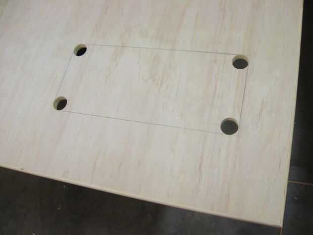 Para mí, que usando máquinas de coser plana mayores en esta tabla. Tienen un tamaño de cama universal (sobre todo). Después de algunos cuidado de medición y marcado, corte una abertura que era seis pulgadas detrás del borde delantero y cuatro pulgadas en el lado. Usé una broca forstner para cortar las esquinas muy bien, y un jig Sierra para cortar el resto.