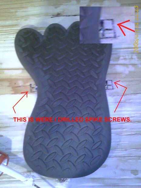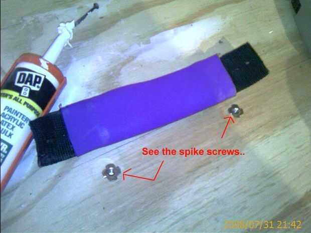 Ver esas cosas plata de la Junta. No sé lo que llaman ellos pero son nueces con picos. Taladro y martillo en. Utiliza para perno en los enlaces. Colóquelos sobre pulgadas sobre la línea de centro para hacer su balance centrado... Hice los agujeros 6.5" aparte para cada correa y 22" entre los dos pies...