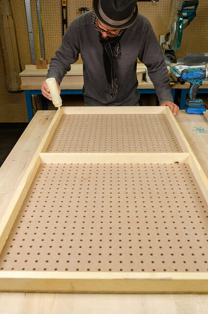 5. Ahora estás listo para perfore y cubeta (opcional) el panel entero. No te olvides pretaladrar a los separadores horizontales, incluyendo uno en el centro, que ahora está oculta.