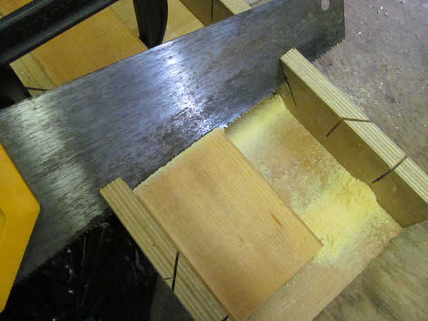 -A continuación tienes que hacer el kicktail. Trazar una línea 5" desde el final de la 2 x 4 y utilizar la caja de ingletes para hacer un corte a lo largo de la línea en un ángulo de 45 grados. Establecer ese pedazo a un lado también.