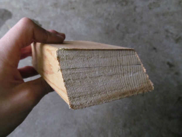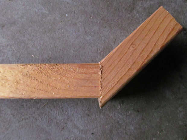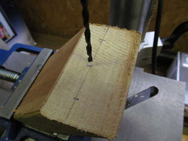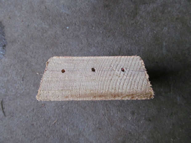 -Perfore tres orificios para los tornillos de 2,5" espacian uniformemente a través de la línea. Asegúrese de sujetar el kicktail de tal manera que la cara angulada es perpendicular a la broca.