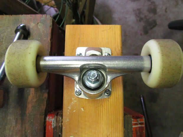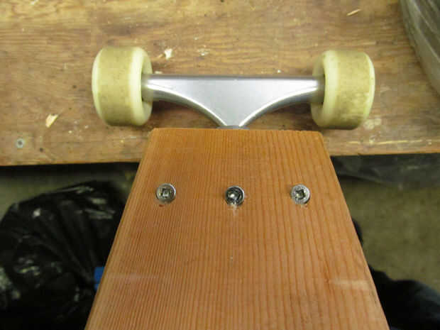 -Debe primero determinar dónde montar los camiones. Asegúrese de montar el camión atrás lo suficientemente lejos del final para que no acaben pegando los tornillos que afianzan el kicktail. Esto es lo que hice;