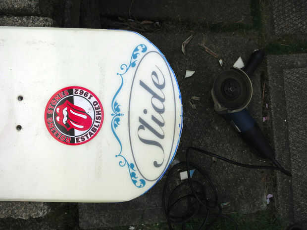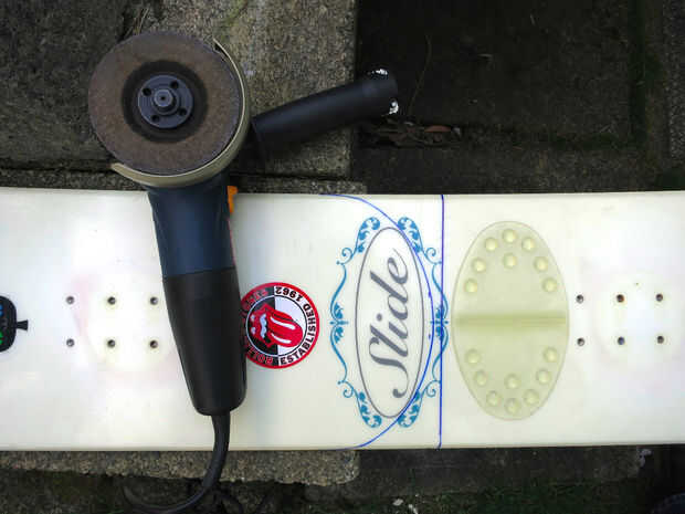 -Tablas de snowboard se hacen generalmente de madera y fibra de vidrio con un borde metálico. Le recomiendo que cubre su boca y nariz durante el corte, porque probablemente la respiración en pequeños pedacitos de la fibra de vidrio no es buena para usted.