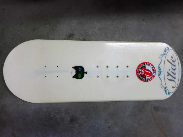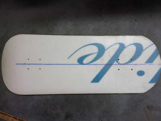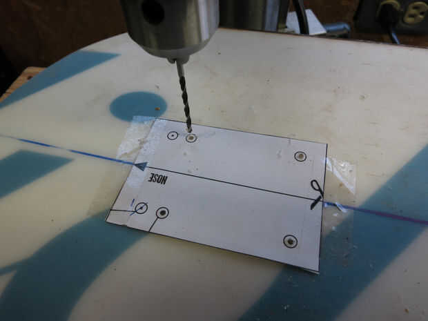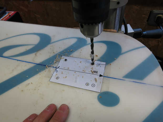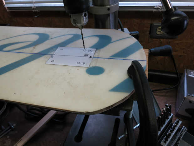 -Amarrar el snowboard en su lugar en la prensa del taladro. Usé una broca pequeña para perforar agujeros piloto antes de taladrar los orificios reales del carro.
