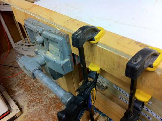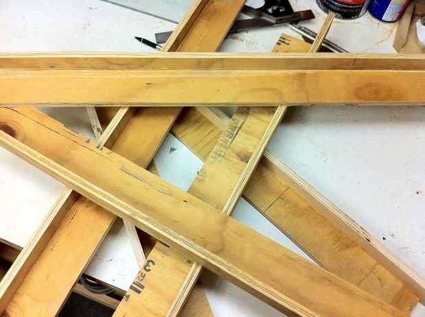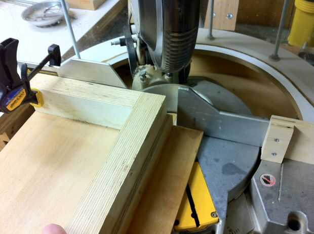 Rasgar trozos de madera contrachapada de 3/8" o 1/2" 1 1/4" y 2 1/4" de ancho. Necesitarás 6 piezas de cada ancho aproximadamente 20" de largo. Más tarde te cortan hasta 19 1/2" después de que se sujetan. Tomar un 2 1/4" pieza, pegamento de madera se aplican a un borde y clavo un 1 1/4" ancho pieza a él (Foto 3). Esto crea seis 20" ángulo lado piezas 1 1/4" x 2 5/8"(foto 4). Recorte los extremos incluso y a una longitud o 19 1/2". Para hacer un triángulo isósceles necesitamos recortar 15° de los extremos para crear ángulos de 30°. En mi sierra, utilizo un tope-guía auxiliar, que es básicamente un ángulo de 90° grandes (Fig 5). Esta valla me permite hacer exactamente este corte con mi sierra para cortar ingletes a 30°. Para cortar el otro extremo de la pieza lateral, usar un 2 x 4 debajo de él para la ayuda. También se podría hacer este corte en una sierra de mesa, Sierra de mano, etc.. No se olvide que se cortan los extremos en direcciones opuestas.