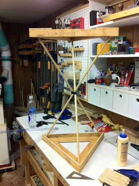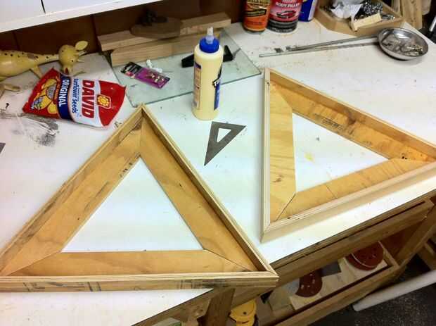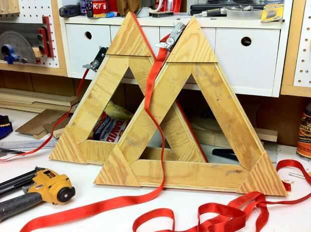 A continuación necesitarás abrazaderas de banda para unir los triángulos después de pegar los bordes (foto 6). Para apoyar a las esquinas, pegamento y clavo un pequeño triángulo en la parte inferior de las esquinas. Cuadro 7 muestra los triángulos terminados listo para su uso. Se puede imaginar cómo los bordes de los marcos Mantenga las patas de la mesa en la posición correcta.