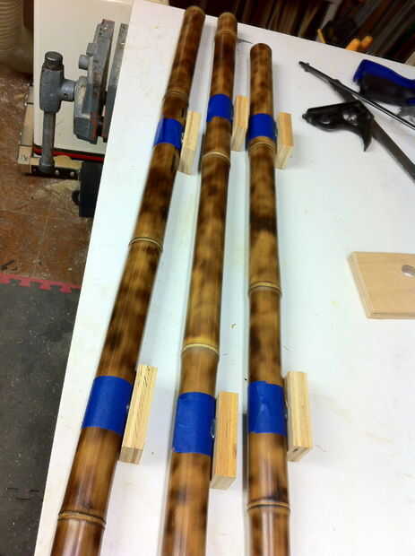 a continuación hay que preparar el bambú a menos que usted eligió otro material a utilizar. Usted necesitará 3 cañas o palos de 36" de largo. El bambú es más fuerte si es termotratado para caramelizar los azúcares en el bambú que aumenta la fuerza. Figura 1 muestra el antes y después. También muestra un agujero perforado a través de todos los diafragmas en el bambú para que el aire puede escapar durante el tratamiento térmico. Si no haga estos agujeros el bambú va a explotar como el aire no tiene cabida para ampliar. Explosión de bambú es algo malo. Yo uso una 36" largo broca que electricistas utilizan ejecutar alambre en las paredes. Alternativamente, se pueden simplemente perforar agujeros a través de los nodos usando una barra de metal.
