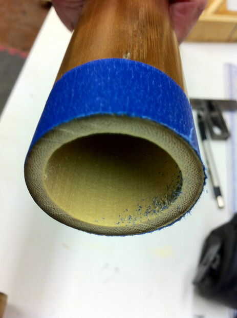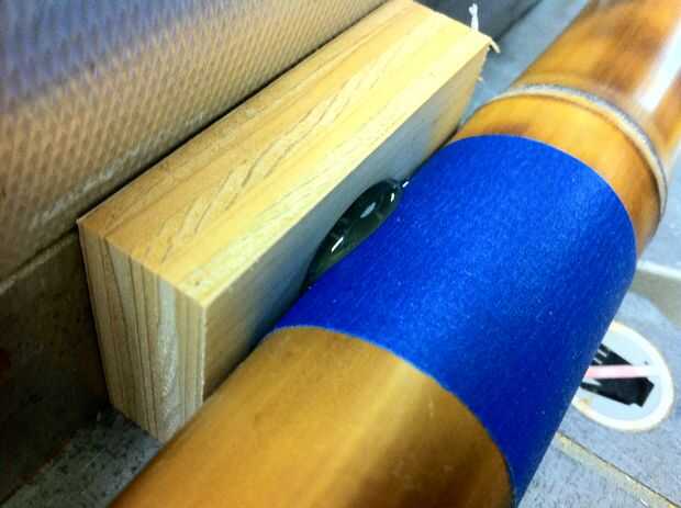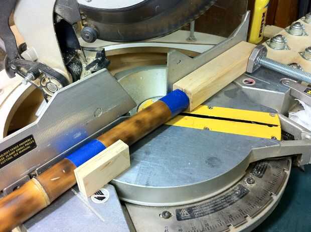 Luego Envuelva el bambú con cinta de pintor más donde hagas el corte. Bambú mal astillas en la parte posterior de un corte a inglete y la cinta es todo lo que necesita para evitar que esto suceda (Foto 2). Ahora para cortar ingletes sierra a 30° y hacer los cortes. Estas 3 piezas tienen una acabado longitud de 36". Recuerde que los extremos se cortan en la misma dirección, a diferencia de los lados de un marco donde se cortan los extremos en direcciones opuestas. También es útil para fijar un bloque a su guía de inglete, por lo que piezas son incluso en longitud (Foto 3). La última imagen muestra los extremos cortados.