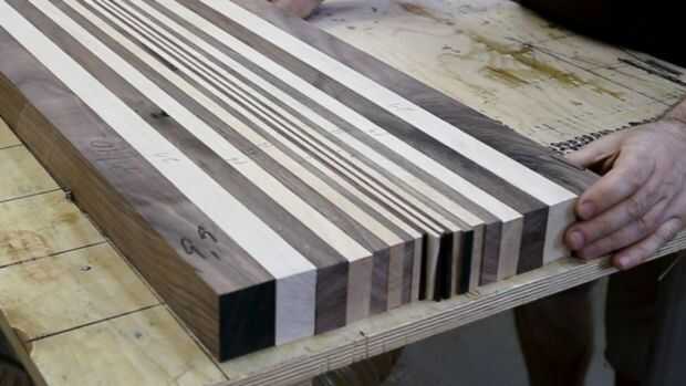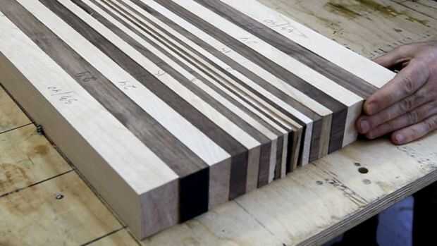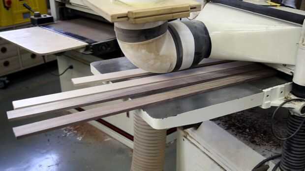 Sierra el arce y las tiras de nogal en la tabla VI para ambos paneles a la vez. Hace 1,5 mm más gruesa que en los dibujos.