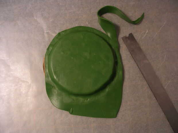 Colocar otra lámina de arcilla sobre la plantilla y smoosh alrededor del área que sobresale. Recorte el exceso en el borde externo.