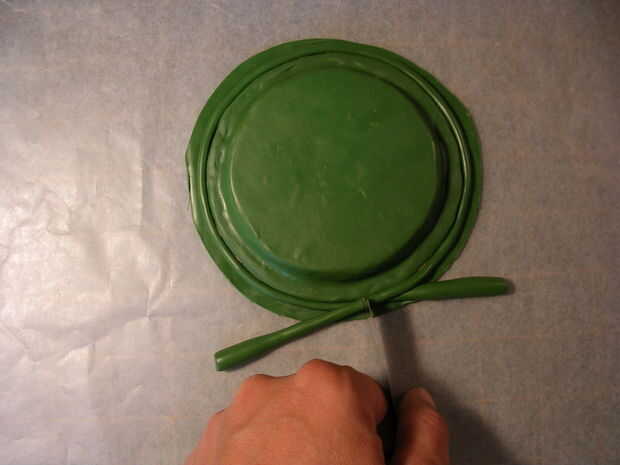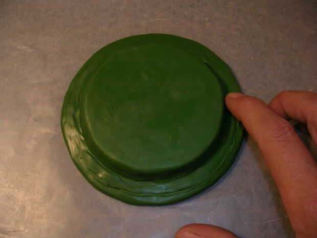 Tomar exceso y rodar en una bola. Rodar la bola en una serpiente con sus manos al igual que cuando eras un niño. Trate de conseguir el mismo espesor como su pieza superior cartón y tiempo suficiente para ir alrededor del borde externo de la tapa. Esto es para suavizar el borde de la tapa.