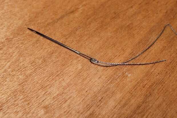 Enhebre la aguja con hilo conductor. Si nunca han enlazado hilo conductor antes puede referirse a nuestro práctico enhebrar una aguja con guía de hilo conductor (imagen 4).
