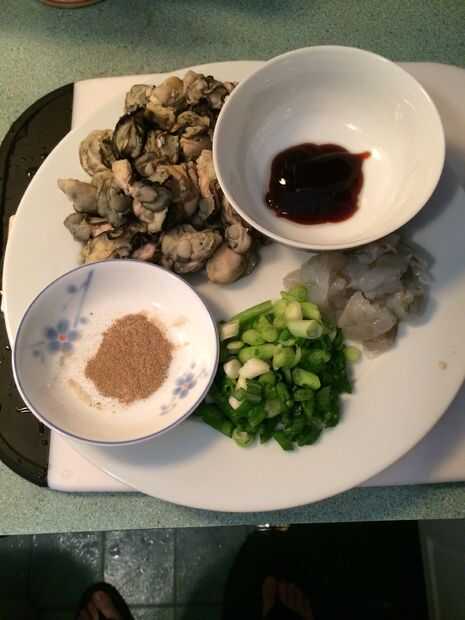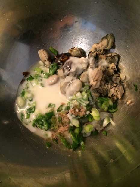 Ahora ya tenemos todo listo. Poner todo en un gran golpe y revuelve hasta junto con las ostras, gambas, pimienta, ostra chalota de salsa verde y disparó harinas agua durante dos minutos.