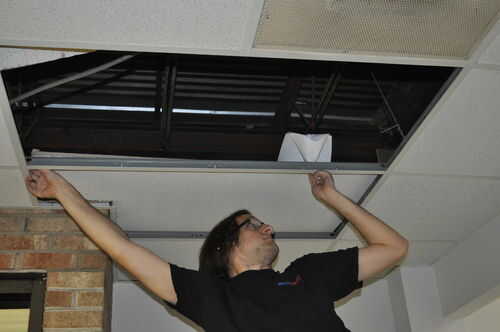En primer lugar, averiguar dónde la cadena de disparo entrará en el techo. Este es un lugar donde la posición de la loseta de techo crea un espacio para él y está en algún lugar donde la cadena puede ser relativamente discreta. (Usted podría incluso moverá otro azulejo del techo si en ninguna parte en la empezó con está suficientemente oculto).