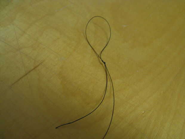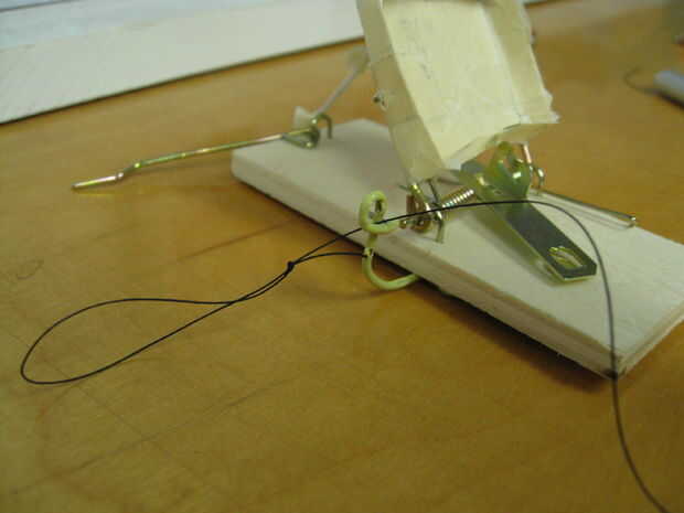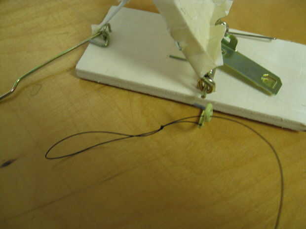 Un nudo en el tripwire con un lazo. Corte el sobrante. Pase el bucle a través del ojete del clip de papel. Luego deslice la varilla a través del lazo en el tripwire.